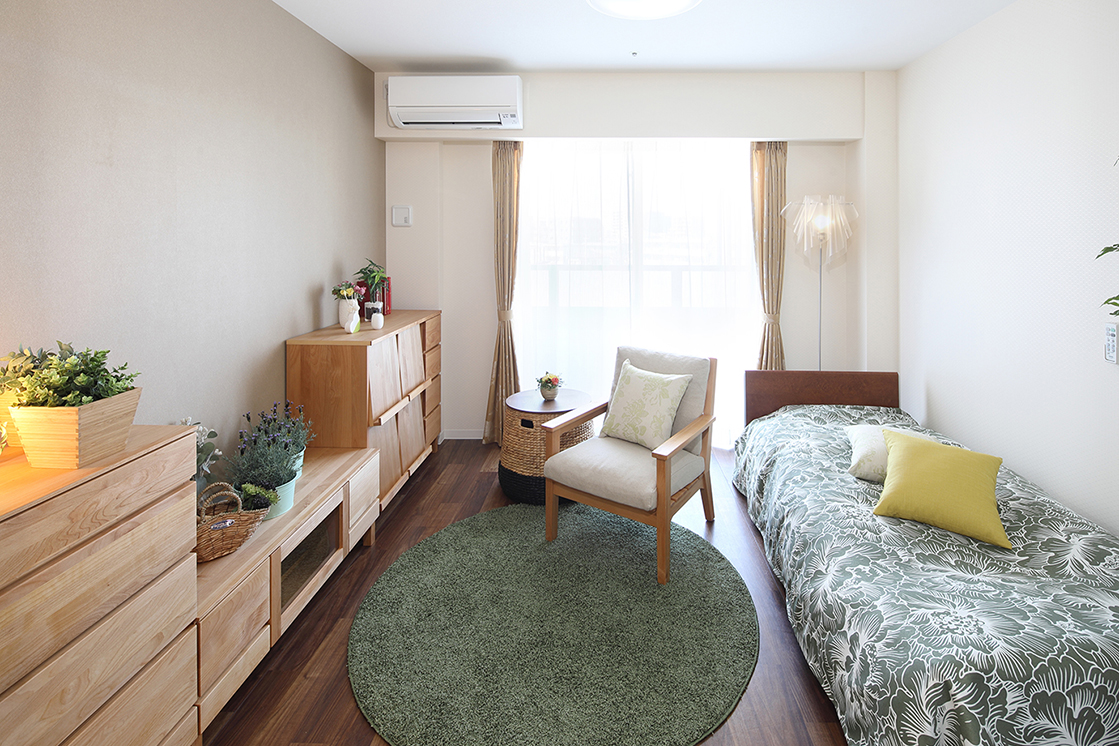 クローゼット、テレビ配線、ナースコール、温水洗浄機能付トイレ、介護用電動ベッド、洗面、電話配線、冷暖房設備 ※すべての居室にない設備もございます。