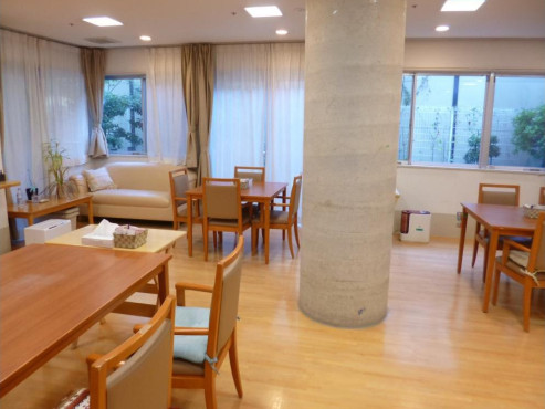 トイレ、リビングルーム兼食堂兼機能訓練室、健康管理室兼事務室、洗濯室、中庭、浴室