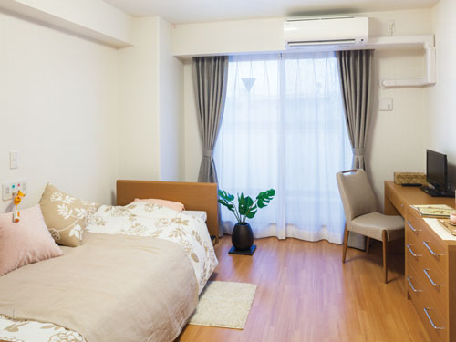 居室には介護用ベッド、寝具、エアコン、クローゼットが備え付けとなっております。