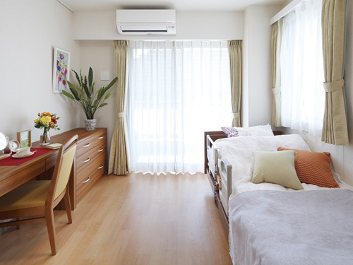 居室には介護用ベッド、寝具、エアコン、クローゼットが備え付けとなっております。