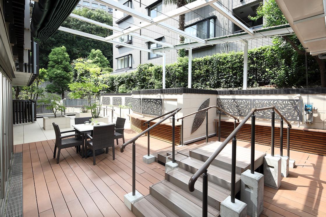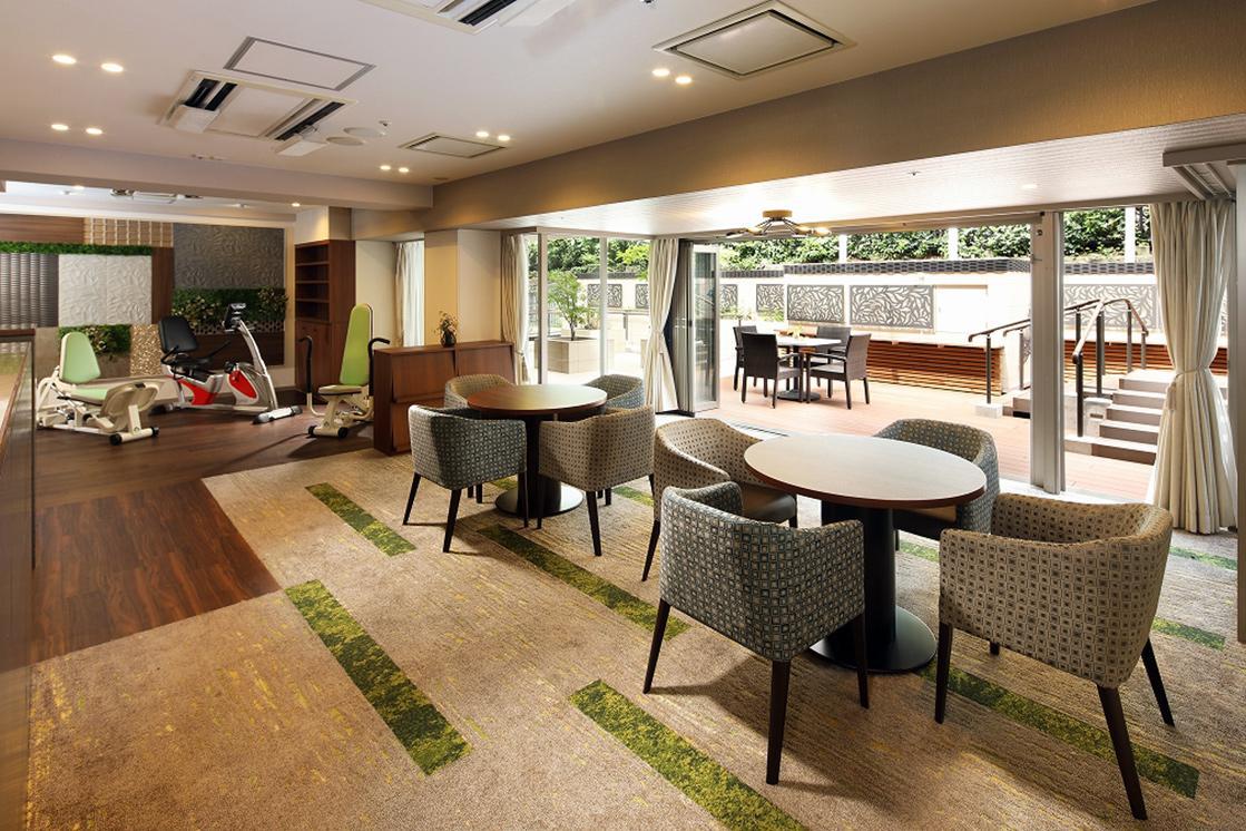 小さな中庭の花や草木を眺めながら、季節のお食事を楽しむ場であると同時に体操やレクリエーションなどの日常使いのほか、コンサートやイベントも行える広さです。