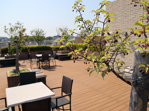 早咲の桜やビワ、サクランボ、キンカンなど実のなる樹木がある、四季を感じる開放感いっぱいの屋上です。
