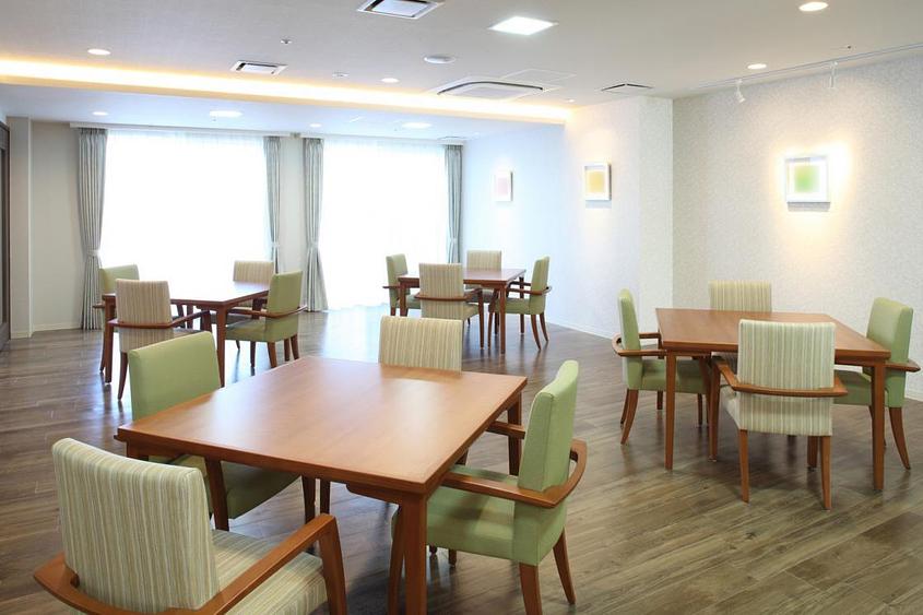 ウッドデッキ、ダイニングルーム、ティールーム、ビューティサロン(各種の外部サービス〔利用者実費負担〕を受けるための部屋)、ファミリールーム、機能訓練室、健康管理室兼事務室、浴室