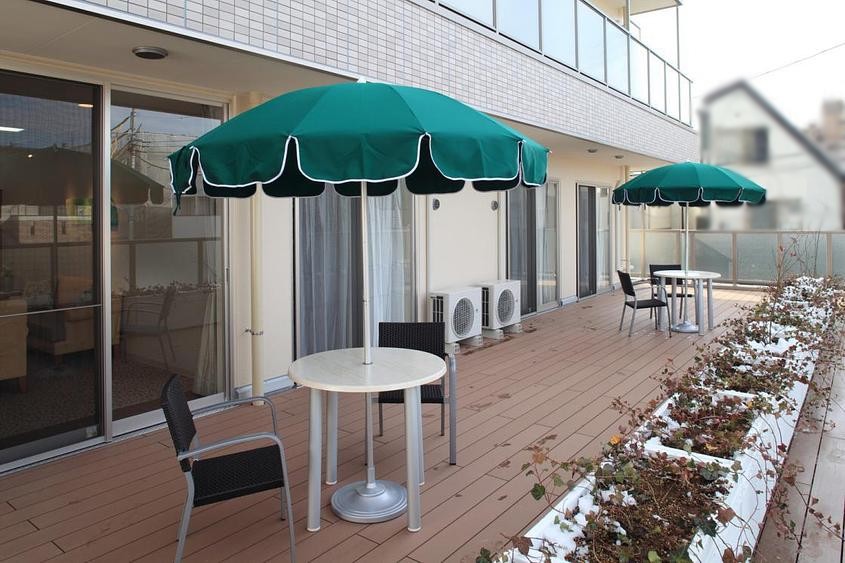 太陽の日差しが気持ちいいテラス。皆様、天気の良い日にはこちらで読書や日光浴をされたり、お茶を楽しんだりしていらっしゃいます。