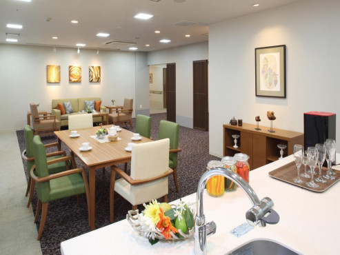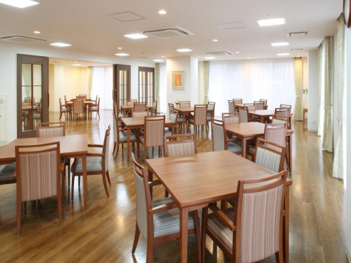 ウッドデッキ、ダイニングルーム兼機能訓練室、ティールーム、ビューティサロン(各種の外部サービス〔利用者実費負担〕を受けるための部屋)、ファミリールーム、健康管理室兼事務室、浴室
