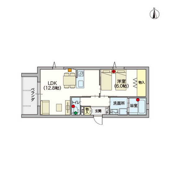 キッチン(IHヒーター付)、エアコン、洗面化粧台、洗浄暖房便座付トイレ、緊急通報装置、コート掛け、玄関収納、収納、浴室(浴室乾燥暖房機能付)、自動火災報知機、洗濯機置き場、ベランダ物干しフック、室内物干しフック、録画機能付テレビドアホン
