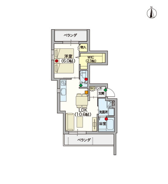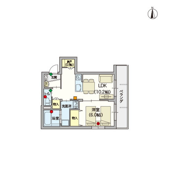 キッチン(IHヒーター付)、エアコン、洗面化粧台、洗浄暖房便座付トイレ、緊急通報装置、コート掛け、玄関収納、収納、浴室(浴室乾燥暖房機能付)、自動火災報知機、洗濯機置き場、ベランダ物干しフック、室内物干しフック、録画機能付テレビドアホン