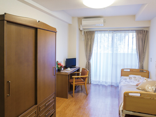 居室には介護用ベッド、寝具、エアコン、クローゼットが備え付けとなっております。