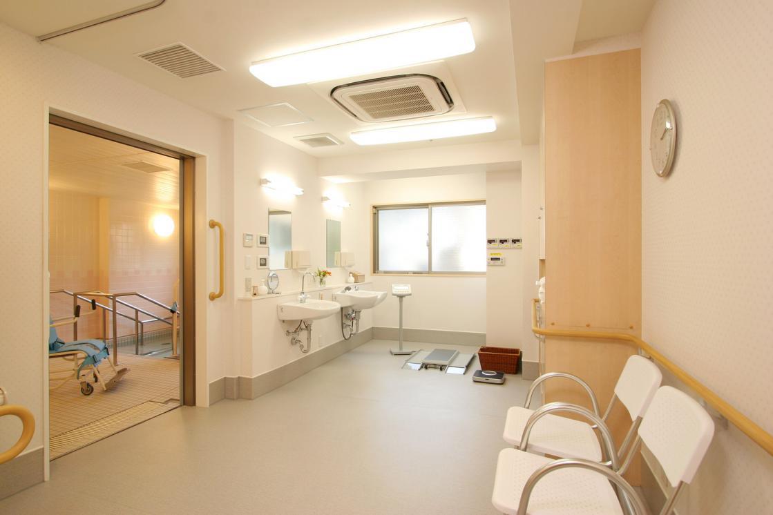 トイレ、リビングルーム兼食堂兼機能訓練室、健康管理室兼事務室、洗濯室、浴室
