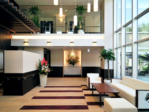 開放感あふれる吹き抜けのエントランスホール。ご入居者・ご家族を温かく迎えます。続きを読む -