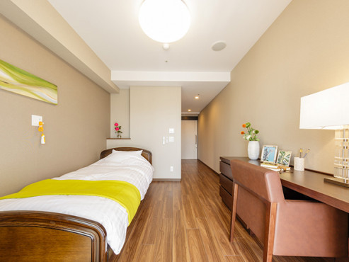 陽の光がそそぎ、清潔感あふれる明るい居室には、機能的なベッドや車いす対応洗面台・トイレをはじめ、床暖房も標準装備。介護サポートを受けながら、快適で安心・安全の日々をお過ごしいただけます。
