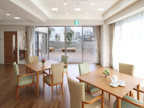 ダイニングルーム兼機能訓練室、ティールーム、ビューティサロン(各種の外部サービス〔利用者実費負担〕を受けるための部屋)、ファミリールーム、健康管理室兼事務室、浴室