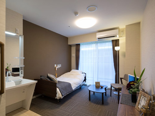 お好きな家具や使い慣れた家具をお持ち込みいただき、ご自宅での生活により近い環境でお過ごしいただけます。エアコン、洗面台(鏡付)、ウォシュレット付トイレ、室内照明、介護用電動ベッド、カーテンは備え付けです。続きを読む -