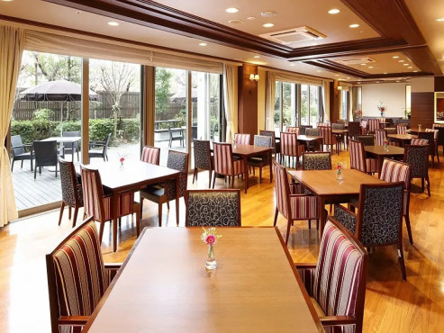 ガラス越しに外の花木を眺め、季節を感じながら食事をお楽しみいただくことができます。不定期に席替えをしていくうちに自然とお友だちができるようになります。