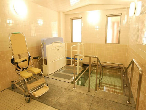 大浴室では車椅子の方も入浴できます。また、浴槽をまたぐのが困難な方でも、階段を下ってお湯に浸かることができます。