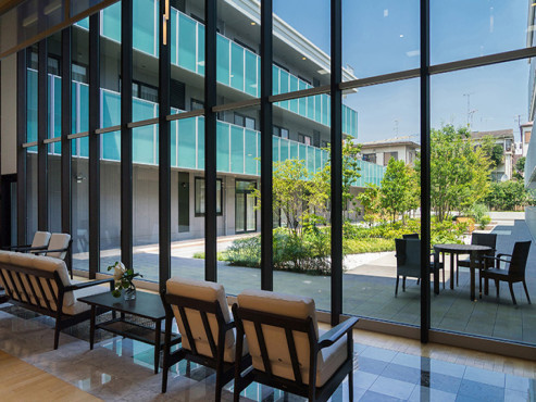 玄関正面の広々としたホール。 二階につながる吹き抜け部は大きなガラス張りで 緑豊かな中庭が望めます。 ソファーでゆったりとした時間をお過ごしください。続きを読む