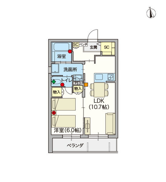 キッチン(IHヒーター付)、エアコン、洗面化粧台、洗浄暖房便座付トイレ、緊急通報装置、コート掛け、玄関収納、収納、浴室(浴室乾燥暖房機能付)、自動火災報知機、洗濯機置き場、ベランダ物干しフック、室内物干しフック、録画機能付テレビドアホン