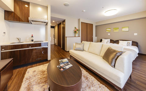 間接照明の優しい明かりを配した居室玄関、清潔感あふれる上質な居室には機能的なベッドや洗面台・トイレをはじめ、床暖房も全居室に標準装備。